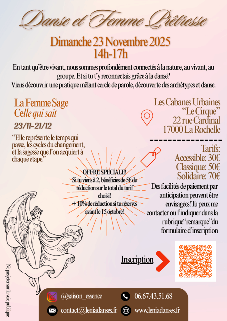 Dans cet atelier de danse, je vous invite à faire corps avec la nature, les astres, et avec vous-même. Venez explorer les différentes puissances en vous: guérisseuse, guerrière, visionnaire…